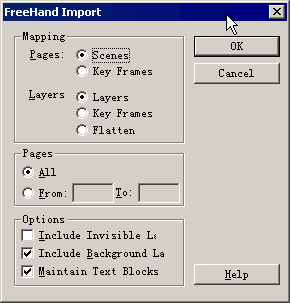 Maping Pages Scenes 选择这个选项,会将 Freehand 文档中的每个页面都转换为 Flash 文档中的一个场景。