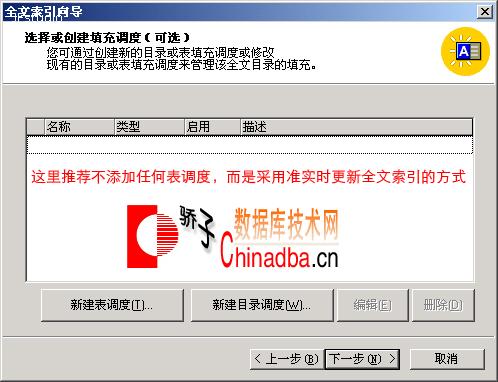 7:接下来会提示对表进行填充调度,为能够准实时地把基表的全文索引列的修改(增、删、改)准实时地应用到全文索引,建议使用下面介绍的其它方法进行索引维护。如 图7 所示,建议不要在这里添加任何调度,直接点击“下一步”。