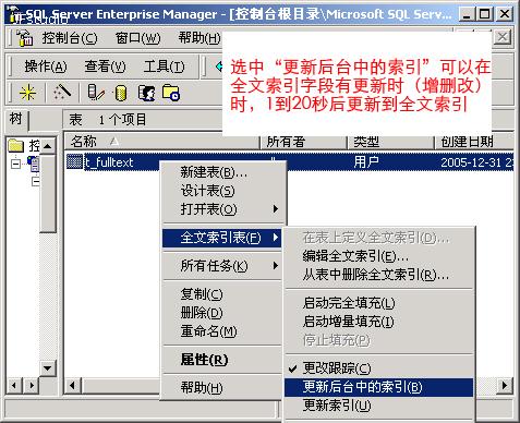 11: 在企业管理器中右击 f_fulltext 表,如 图11 所示,选中“更新后台中的索引”。