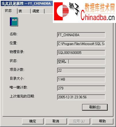 12:可以通过双击全文目录下的全文索引,查看该全文目录的属性,如 图12 所示,状态为“空闲”,而项目计数大于0,则表示完全填充已经完成了。