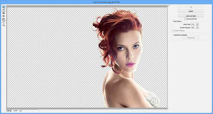 14、选择前景图层并Ctrl+J进行一个复制,这里我们应该有两个复制的前景图层。 选择最先复制的那个前景图层(该图层应该位于中间)。从滤镜菜单中选择液化,并打开液化对话框,使用向前变形工具。