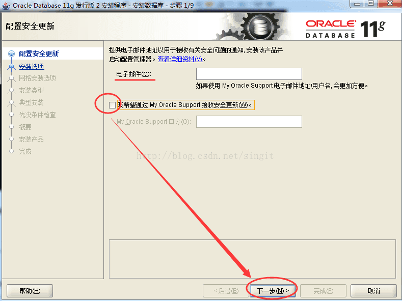 4)安装选项:邮箱可以不填,(之后会提示你是否不希望收到安全更新的通知,点击“是”)把更新的“√”去掉。如下图,然后nest