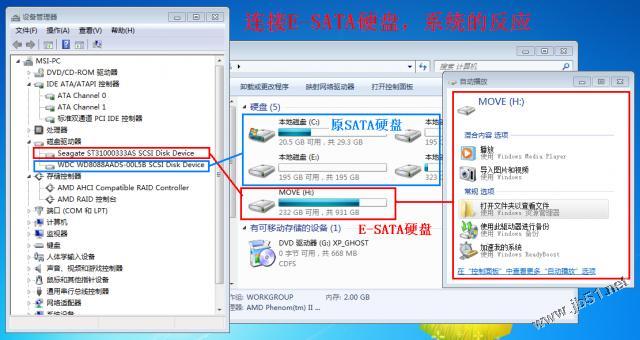 WIN 7 32位和64位支持E-SATA。按前面介绍的连接,以及BIOS开启AHCI,同样可以热插拔E-SATA硬盘。