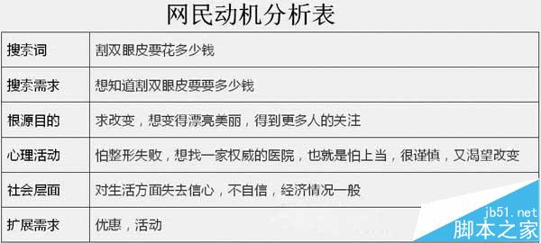 此外,我们需要更加深一步的去分析,创意分析,展现出来的创意标题和描述是否真的达到网民的需求?搜索词分析,每一个不同属性的搜索词背后都反应了网民不同的搜索需求和心理活动,下面我们以"割双眼皮要花多少钱"这个关键词来透彻分析这个网民的搜索需求,根源目的,心理活动,社会层面,扩展需求,五个分析要点。如图: