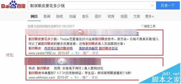 通常我们在分析关键词数据和搜索词数据的时候,我们必须要清楚的了解到这四点是否达到一一对应,关键词被点击后对应的搜索词是什么词?这个关键词触发的创意是什么样的创意?看到创意之后点击进入我们的文章页是什么文章页?这四个环节有没有把它做到同一条线上,达到一一对应,如果一个患者搜索“割双眼皮要花多少钱”,触发到账户中“割双眼皮”这个关键词被展现出来,如图下:你觉得哪条创意是这个客户真正所需求的信息。
