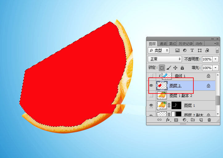 5、把橘子图层复制一层,副本图层隐藏;选择原图层,用钢笔工具左边切开的部分路径。