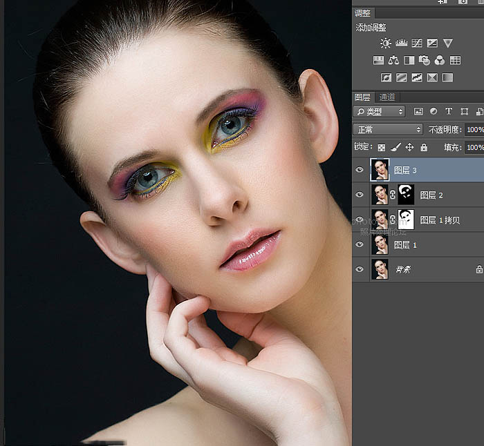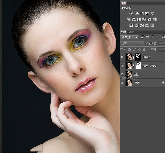 7、然后按住Alt给锐化好的图层2添加黑色蒙版,用白色画笔工具擦出需要锐化的地方(眼睛眉毛,头发,嘴唇)。