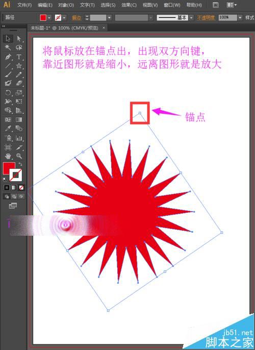 5、我们将鼠标放到锚点上,我们可以看到一个两个方向的箭头,直接点击向图形移动就是缩小,远离图形就是放大。