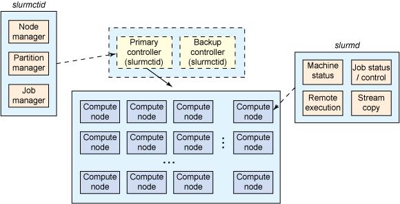 SLURM 通过一对冗余集群控制节点(冗余是可选的)来管理集群计算节点,是由一个名为 slurmctld 的管理守护程序实现的,slurmctld 提供了对计算资源的监视、分配和管理,并将进入的作业序列映射和分发到各个计算节点上。每个计算节点也有一个守护程序 slurmd,slurmd 管理在其上运行的节点,监视节点上运行的任务、接受来自控制节点的请求和工作、将工作映射到节点内部等等。图示如下: