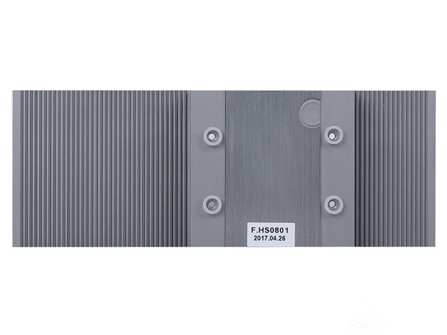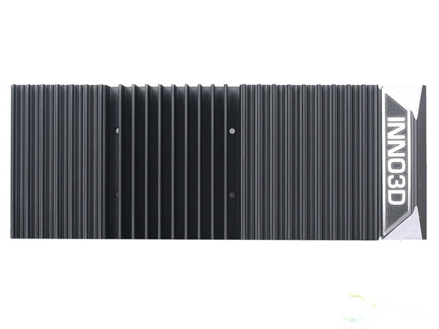 映众 GT 1030 ITX 战神版显卡使用的是一整块铝挤散热模块,通体为铝材本色,是市面上比较常见的被动式散热方案。在散热块的正面有一个金属铭牌,上面印有映众的英文logo。