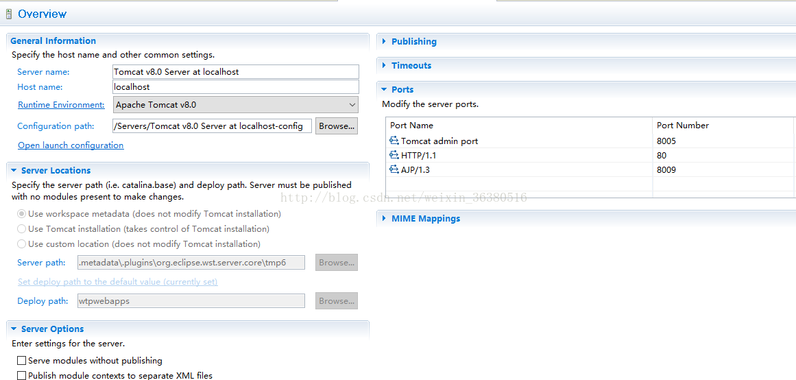 我们可以看到在Server locations中有3个选项,在上图中选择的是第一个选项,这由Eclipse对tomcat的配置进行管理,对应的虚拟配置目录在图片中的Server Path一栏中。