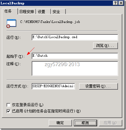 这里回顾一下,两个版本操作系统的任务计划的不一样,Windows Server 2003 下面可以选择的内容,项目并不多,不过他默认的情况下会将起始于填写进去,使用的就是所在脚本的上一级目录。