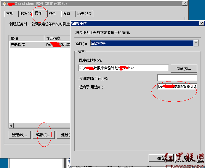 2、在操作选项卡里的“起始于(可选)”要填上bat批处理文件所在目录,windows 2003是在选择bat批处理文件自动带上的,而2008不会,虽然它提示是可选的,但是不填的话,执行会失败;