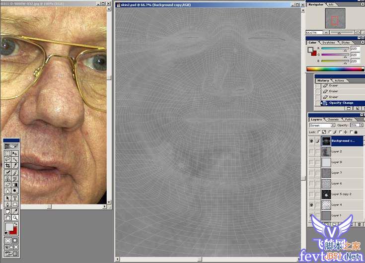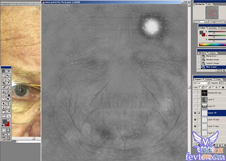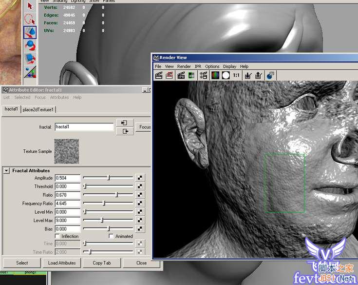 我们始终需要一张好的参照图片去绘制图片,下面是我用来参照的图片,我没有找一张干净光滑的皮肤图片,恰恰完全相反找了一张满脸疙疙 瘩瘩的!! 06通常我将回开始绘制凹凸贴图的细节,并且在开始的时候往往是比较困难的,在这个教程中,我是用一些maya的程序纹理作为基础来绘制凹凸 图的。