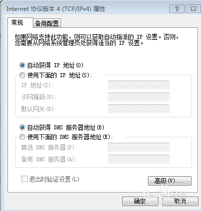 4、选择“Internet 协议版本4”,点击“属性”,出现如下对话框,如果您是实用路由器来上网,那么选择“自动获得IP地址”和“自动获得DNS服务器地址”即可,然后点击“确定”。