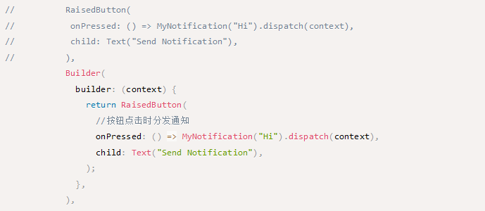 原因是通知在分发的时候,需要一个context参数,这个参数指的是Notification监听的子widget的context,如果按照注释部分的写法的话,context是根widget的,这样会导致监听不到子widget了。