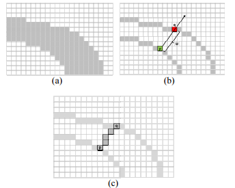 首先, 用canny edge detector 把 a 变成b, 对于在edge上一点p, 沿着p的梯度方向, 也就是沿着射线 rayr=p+n·dp, n>0寻找另一edge点q, 如果q的梯度方向与p的相反(误差为30度), 则将p、q两点的距离作为字符的宽度, 除非它已有更细的宽度(最开始字符宽度默认为无穷大). 换句话说, 如果不能找到q, 或者q的梯度方向不与p相反, 那么这个射线ray就舍弃(discard)掉了