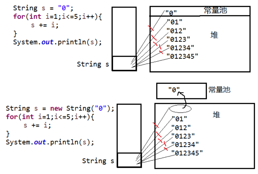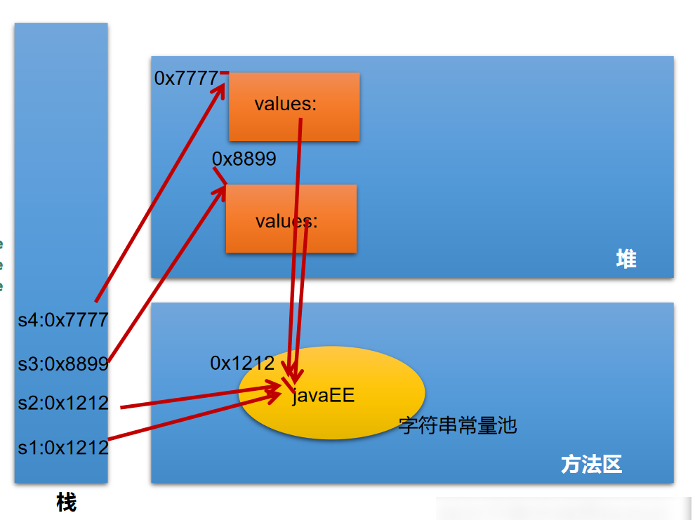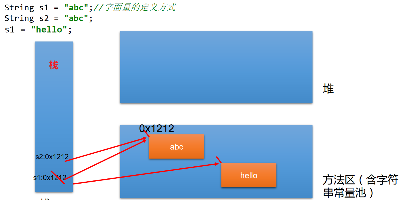* 5.通过字面量的方式(区别于new)给一个字符串赋值,此时的字符串值声明在字符串常量池中。