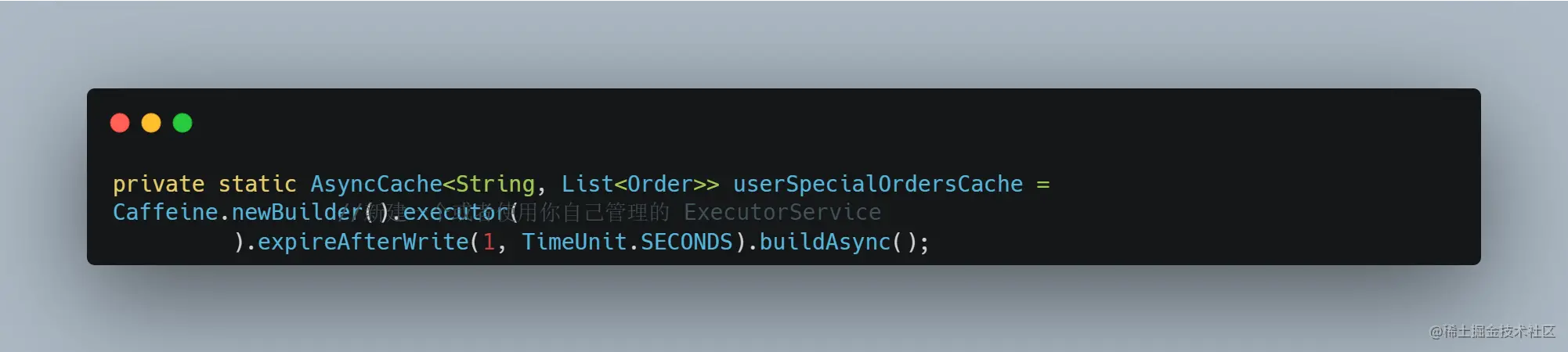 通过堆栈我们发现大部分线程阻塞在读取加载这个本地 Caffeine 缓存,我们使用 Caffeine 代码,其实很简单,缓存配置如下: