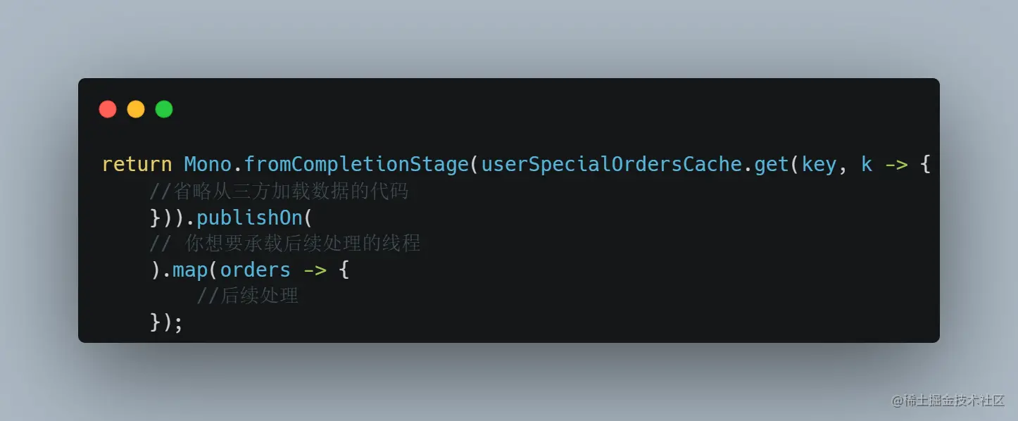 2.外层包裹 webflux 响应式非阻塞代码,最好在缓存之后,切换下线程池为你原始的线程池,否则可能后续有人写代码失误报错,结果报错的线程是加载缓存的线程导致误会,或者引入一些阻塞代码导致加载缓存的线程阻塞让你误会是因为加载缓慢: