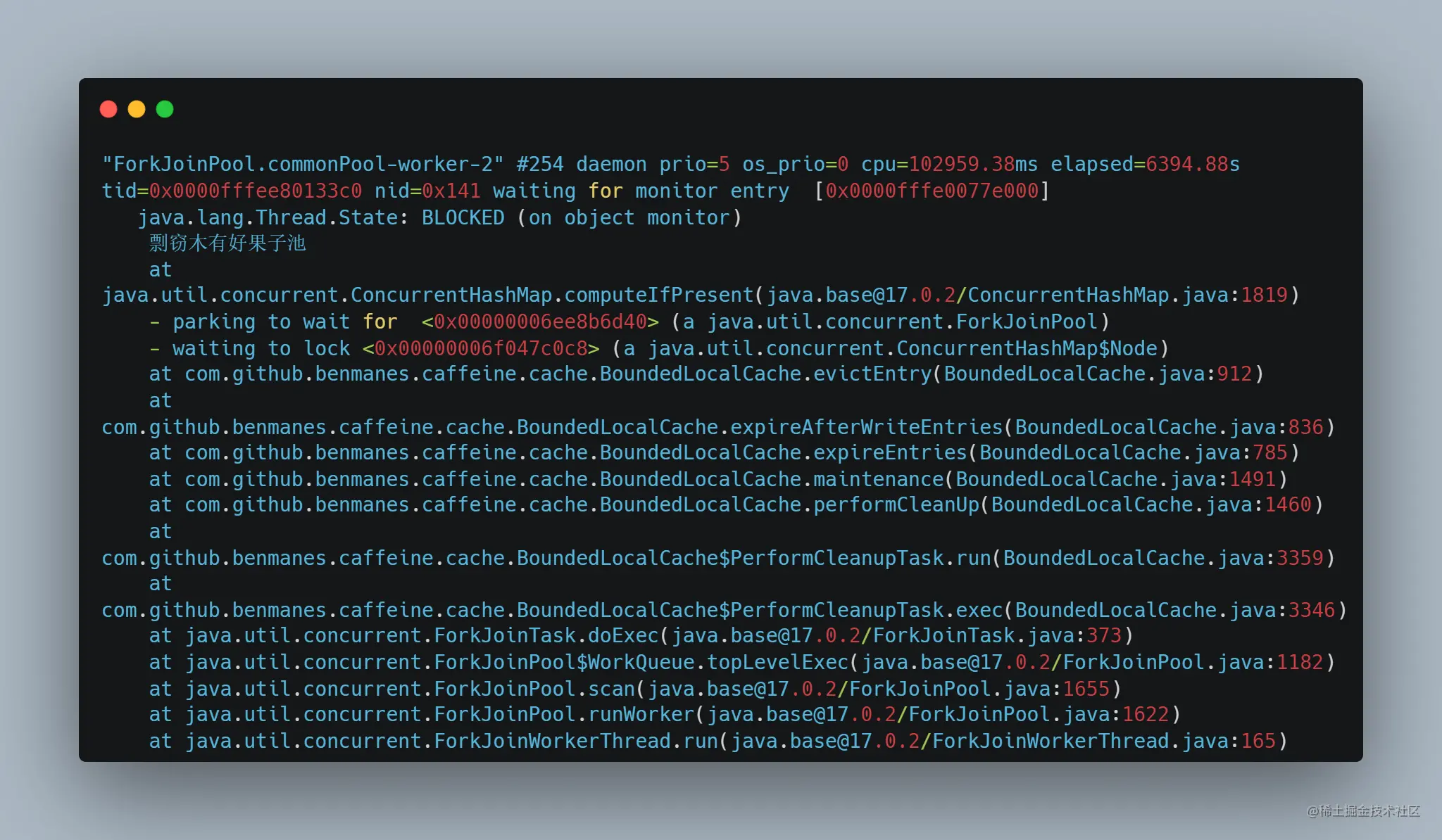 这个线程是 Java 8 之后,ForkJoinPool 会默认创建一个大小为可用 CPU * 2 的 ForkJoinPool,通过 ForkJoinPool.commonPool() 访问。JDK 中的很多东西,如果不指定线程池,那么就会交给这个线程池去执行,例如直接使用 parallelStream,以及不指定线程池执行 CompletableFuture 等等。显然,通过上面的线程栈可以看出,caffeine 默认将缓存的定时检查过期交给 ForkJoinPool.commonPool() 了。但是奇怪的是,这个线程虽然持有了大部分 http srvlet 线程在等待的锁,它自己却在阻塞等待其他锁,这是咋回事呢?