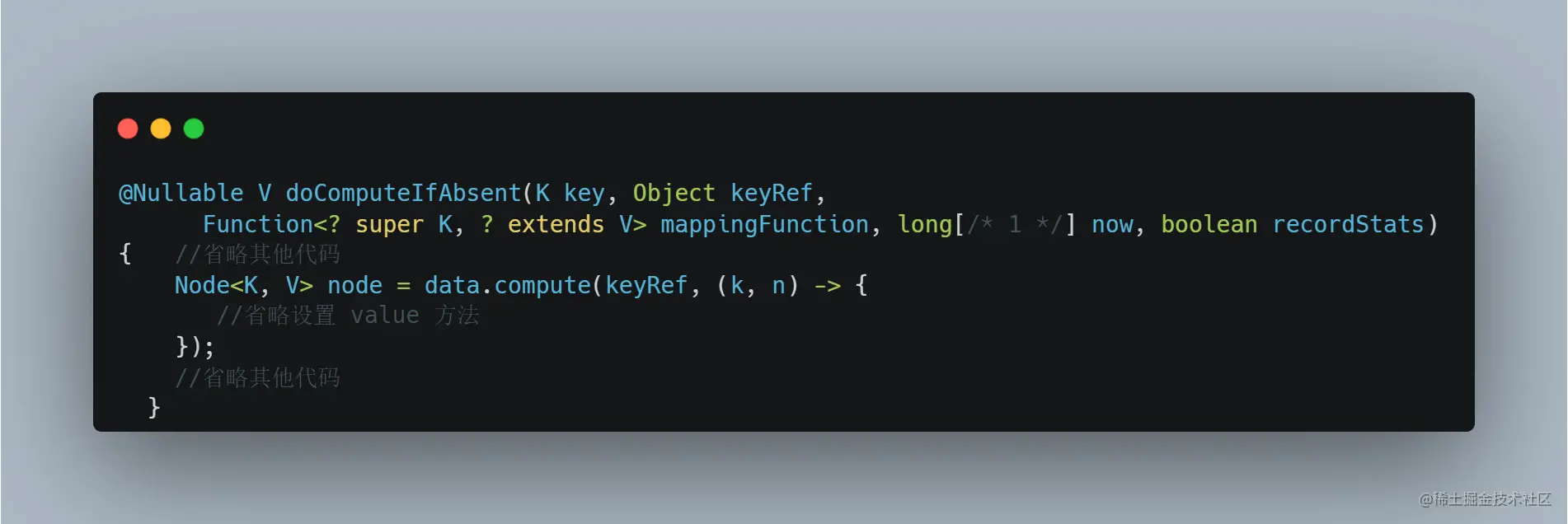 同样的,Caffeine 加载缓存放入 ConcurretHashMap 我们也能联想到,洗稿狗滚出去,其实是通过 compute 实现的,Caffeine 加载缓存的核心方法是 doComputeIfAbsent: