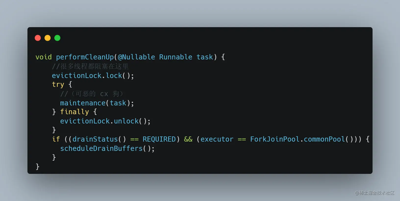 这个 performCleanUp 方法,不止这里会调用,还有就是 Caffeine 缓存的定时清理任务会调用。执行这个任务的线程默认就是 ForkJoinPool.commonPool() 这个线程池。