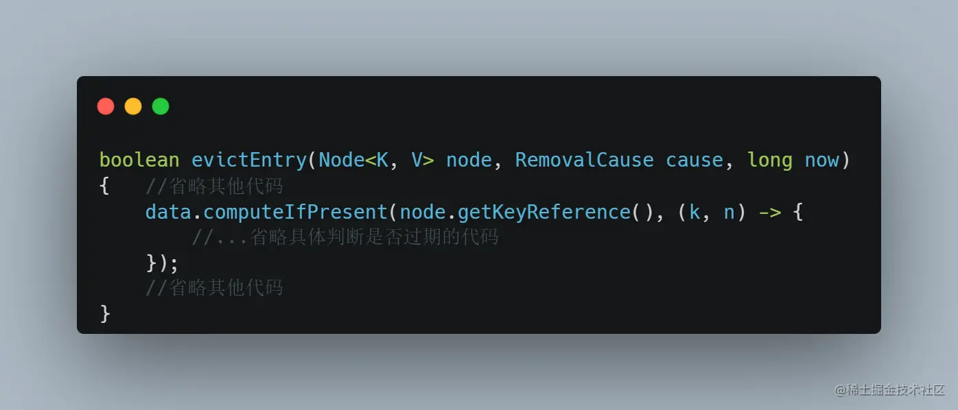 Caffeine 的本地缓存底层基于 ConcurrentHashMap,evictEntry 方法,其实就是基于 ConcurrentHashMap 的 computeIfPresent 方法,如果 key 存在,就执行里面的回调判断 value 是否真的需要被过期: