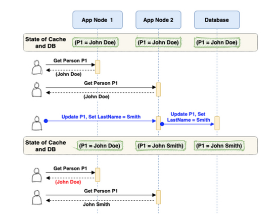 如您所见,第二个请求已将人名更新为“ John Smith ”。但由于它没有更新缓存,因此从此处开始的所有请求都将从缓存中获取过时的个人记录(“ John Doe ”),直到该项在缓存中被删除/更新。
