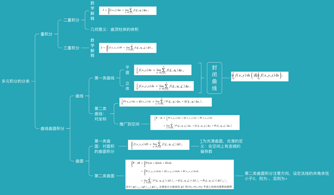 多元积分大致可以分为重积分和曲线曲面积分两种。根据下方的思维导图的分析,大致可以窥知一二。