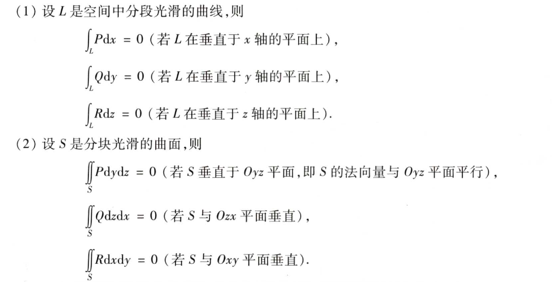 由于第二类曲线曲面积分本质上是求投影在某个面/线上的值,以下特殊情况在具体计算中可以用到,即凑出积分值为0的第二类曲线曲面积分的情况: