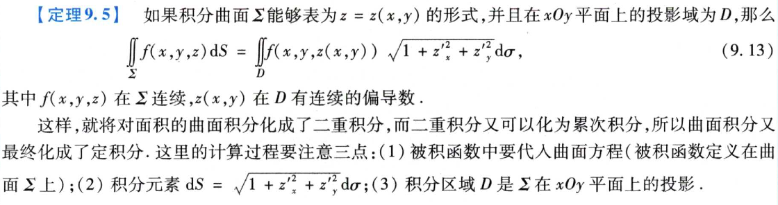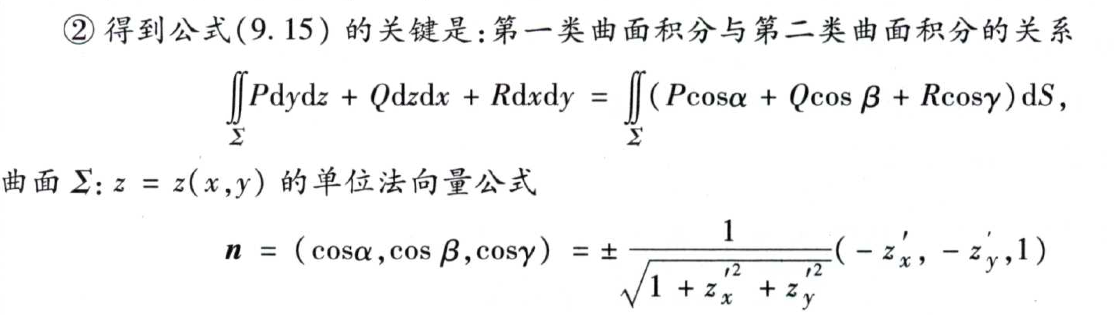 基于法向量的求法,可以求得9.15中偏微分的式子。从本质上来看,对于第二类曲面积分的计算的过程大致为:第二类????第一类????重积分,由此将计算过程转为便于计算的方式。