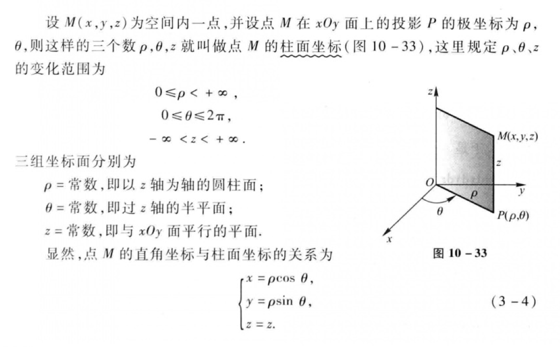 柱坐标是什么?看完下图同济教材的解析,应该可以有一定的了解。在这个坐标中,z坐标上为线性变换的量,而x轴和y轴则是在平面上进行变换。