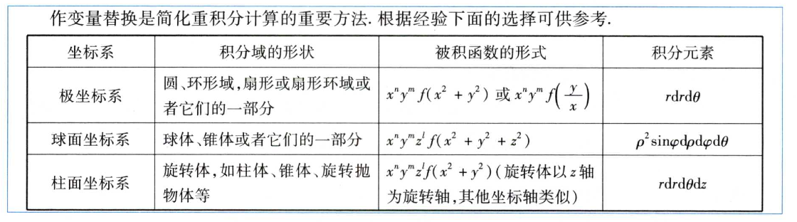 三种坐标的积分顺序的变换的选择大致可以依照下表。