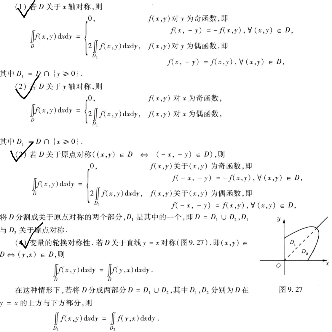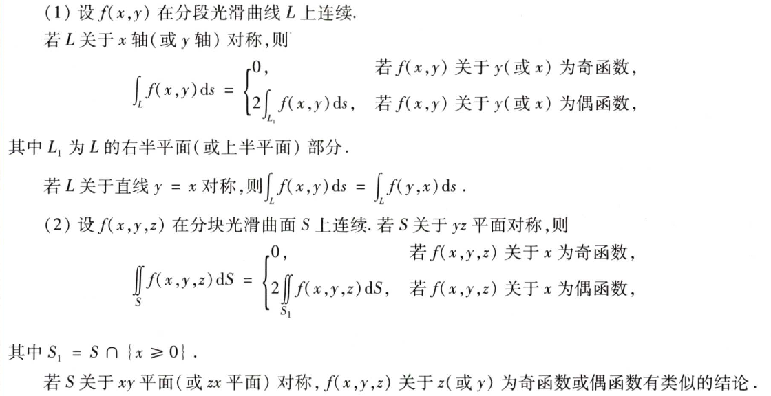 若函数的积分曲线/面关于某坐标轴或者某平面对称,则函数在关于另一个参数的坐标轴/平面时奇函数的时候积分为0,否则积分为2倍。