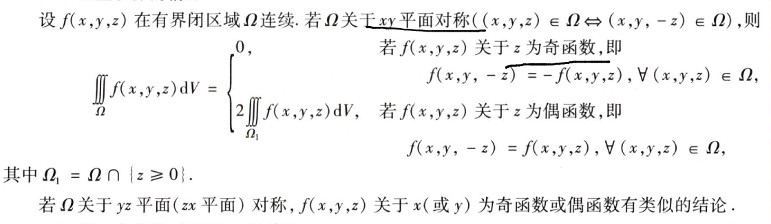 若积分区域关于某平面对称,则函数为第三个字母的奇函数时,积分为0,否则为积分的2倍,具体如下: