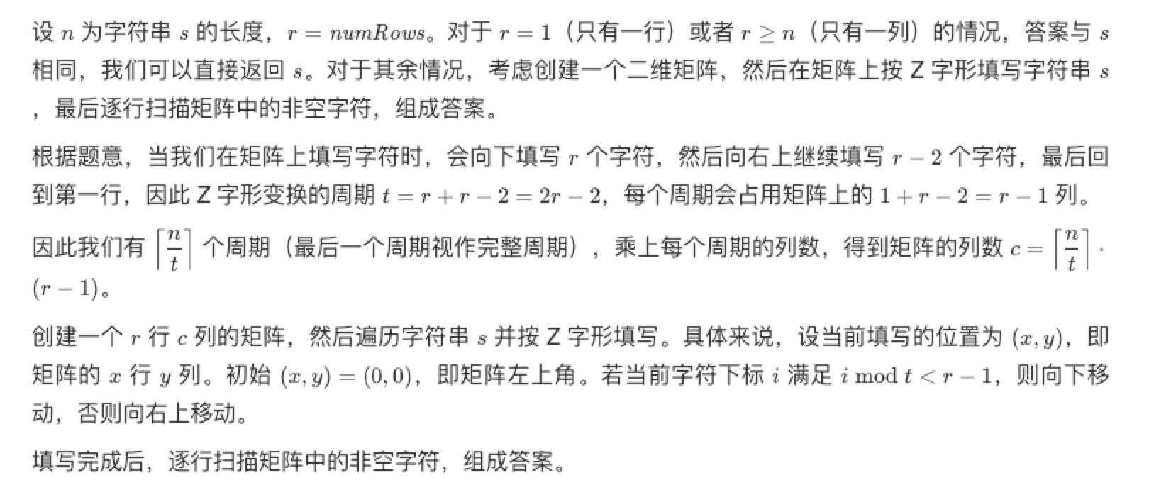 这个需要考虑到进行 Z 字形转换后字符是放到一个矩阵内的,矩阵的行数是r行,矩阵的列数由矩字符的长度n和行数r共同决定,一个周期内的字符数为 t = r + r -2 = 2r-2,列数为( n + t - 1)/r,这里是 加了一个周期减去1个字符的长度,这样在除以(整除)行数的时候得到的周期数就不会因为最后一个周期不足一个完整的周期,而使得周期数减少1了(说白了就是不足一个周期当做一个周期),一个周期内在同一行的字符数量:一个周期内在矩阵的第一行以及在第 r 行只有一个字符,一个周期内在矩阵其余行为两个字符。