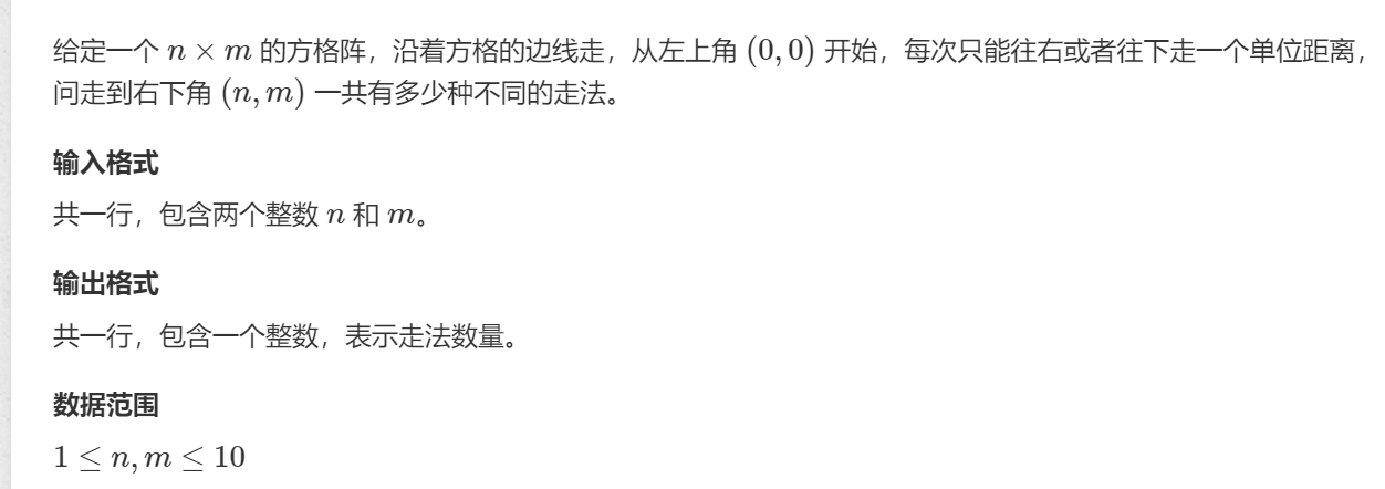 f[i][j] 表示走到点 (i,j) 的方案数,由于每次只能往下走或往右走,所以点 (i,j) 只能从点 (i−1,j) 或点 (i,j−1) 上走过来