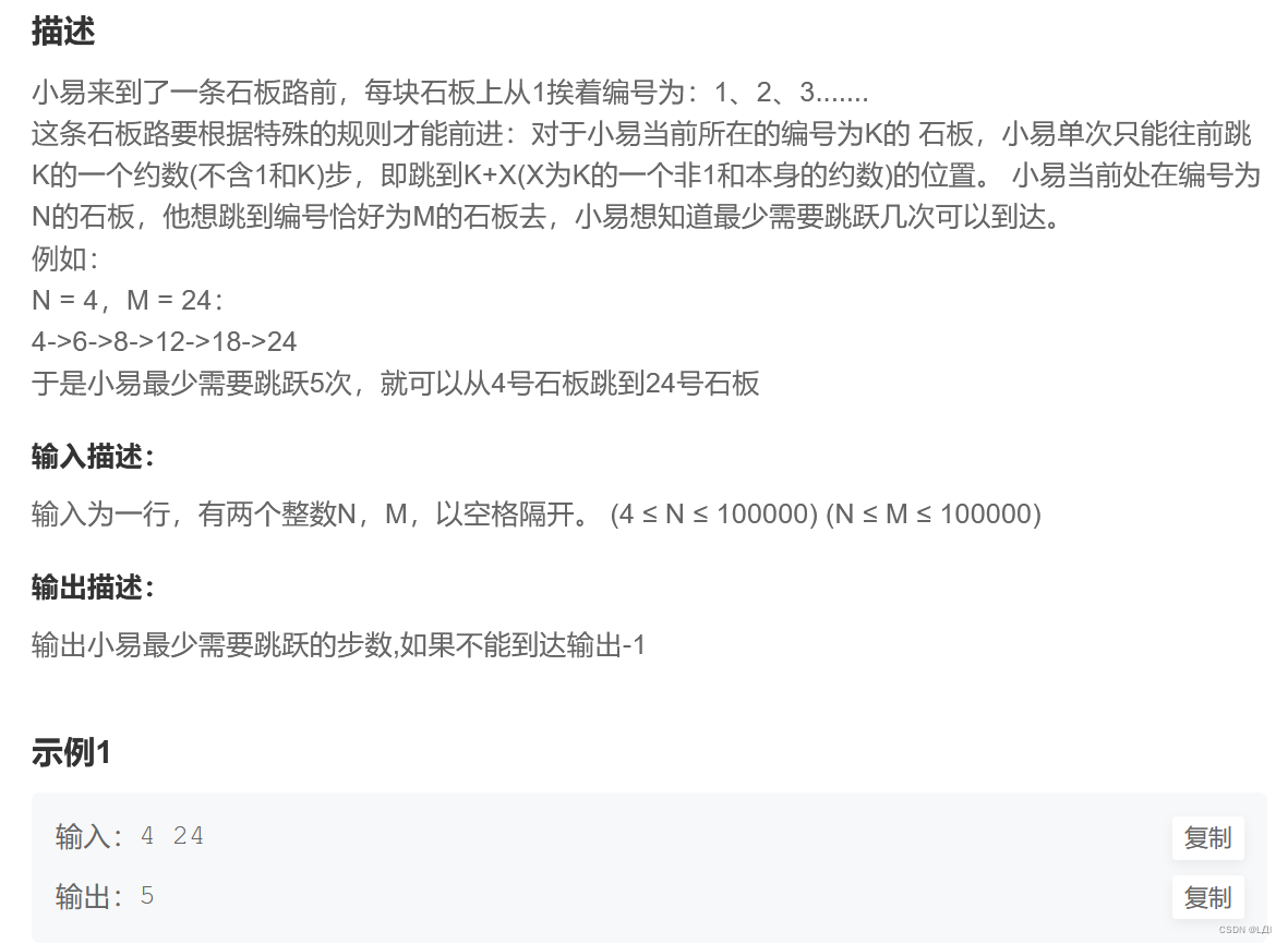 采用动态规划思想求解。创建一个vector容器steps,steps[i]表示到达i号石板所需的最小步数。初始化为steps容器为INT_MAX。从序号N的石板开始逐个遍历,若steps[i]为INT_MAX,表示该点不可到达,直接开始下次循环。若steps[i]不为INT_MAX,表示该点可以到达,下面求解编号i的约数,进行动态规划。动态规划的转移方程为