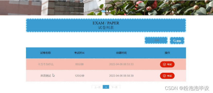 点击试卷,用户可以查看试卷列表,包括:试卷名称、考试时长、创建时间等,用户可以对试卷信息进行搜索或考试等操作,如图5-5所示。