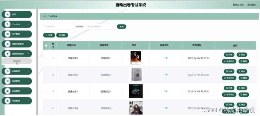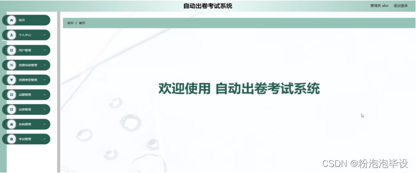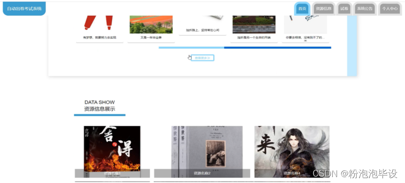 自动出卷考试系统,在系统首页可以查看首页、资源信息、试卷、系统公告、个人中心等内容进行详细操作,如图5-3所示。