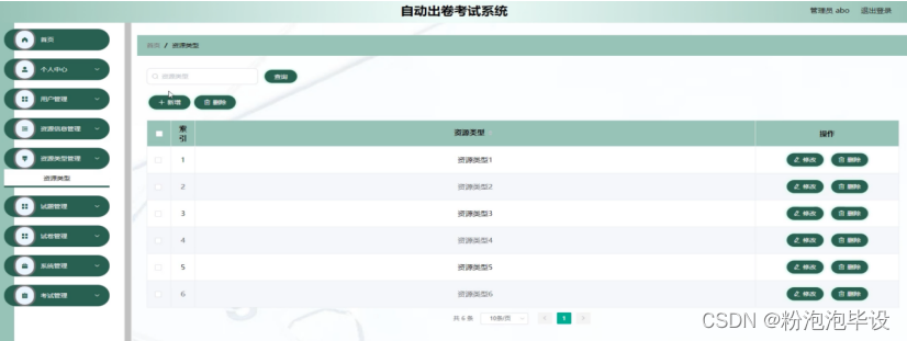 管理员登录系统后,可以对个人中心、用户管理、资源信息管理、资源类型管理、试题管理、试卷管理、系统管理、考试管理等功能进行相应操作,如图5-8所示。
