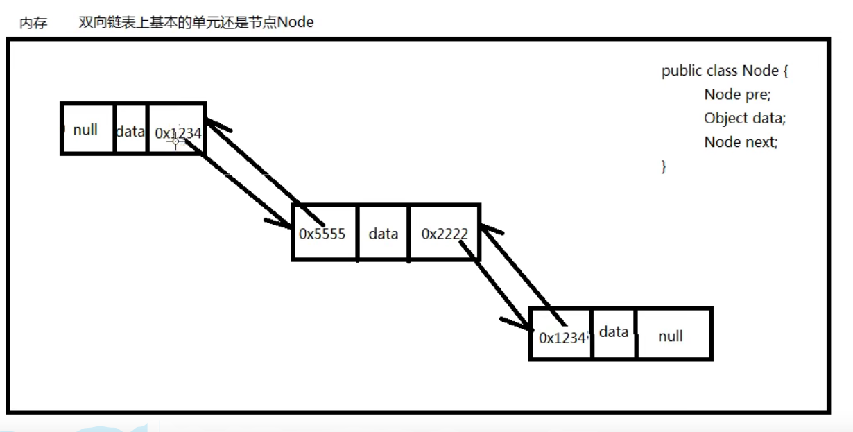 public class Node{ Node pre; Object data; Node next; }