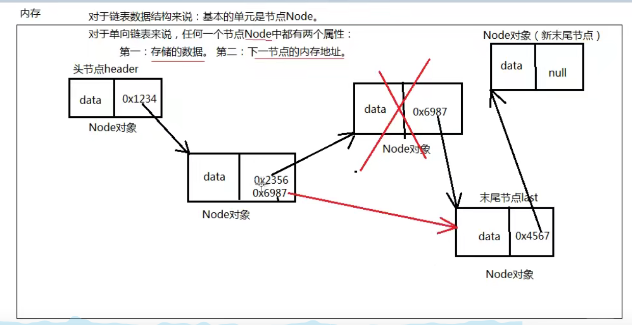 对于链表数据结构 基本单元是节点Node 对于单链表数据结构 每个节点Node都有两个属性:1.存储的数据 2. 是下一个节点的内存地址