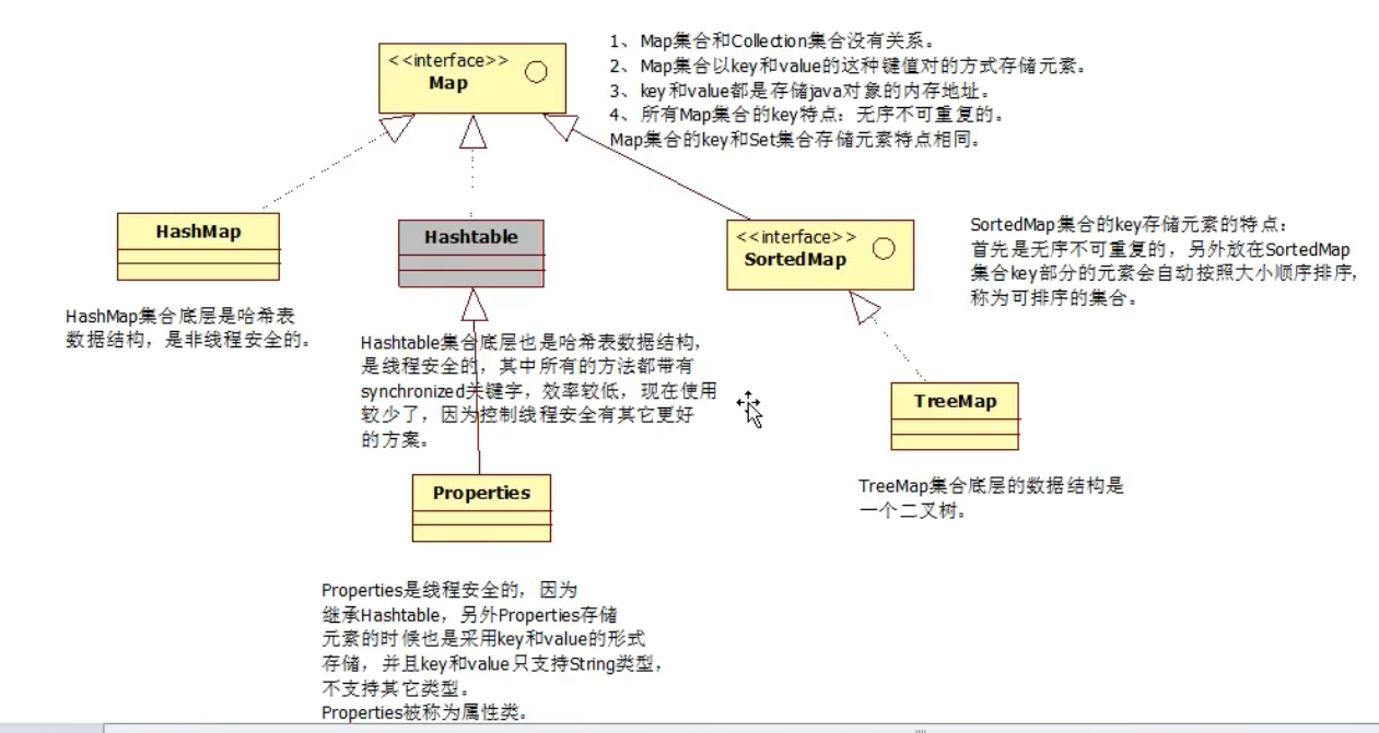 Map集合和Collection集合没有关系 Map集合以key-value这种键值对的方式存储元素 key和value都是存储java对象的内存地址 所有Map集合的key都是无需不可重复的