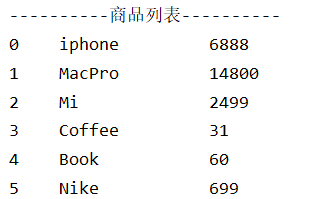 products = [["iphone",6888],["MacPro",14800],["Mi",2499],["Coffee",31],["Book",60],["Nike",699]]