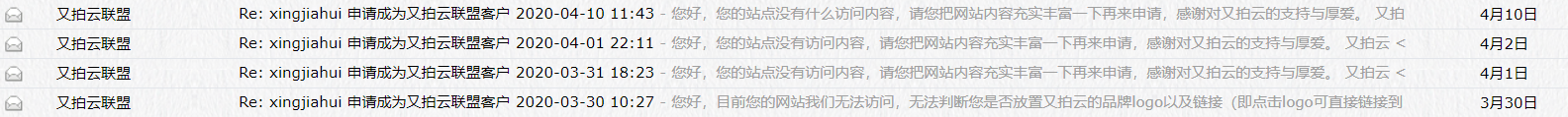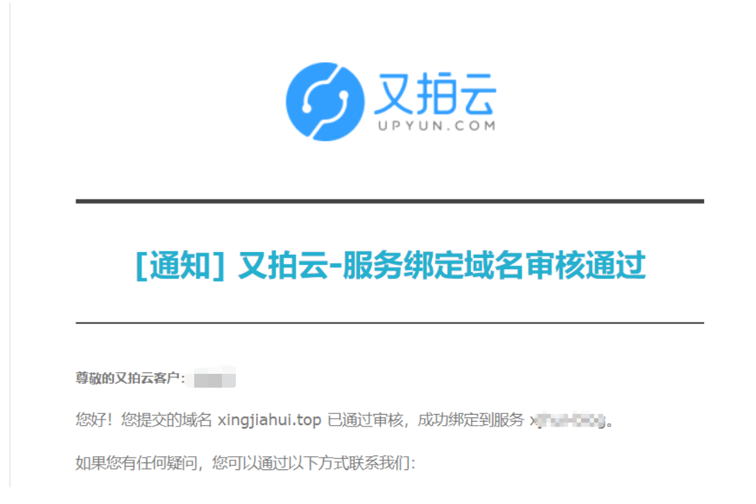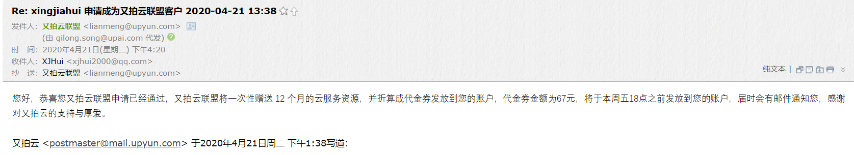 收到下面的邮件代表已经成功加入又拍云联盟,但还不能去用