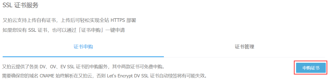 需要一个SSL证书,又拍云提供免费SSL证书申请。