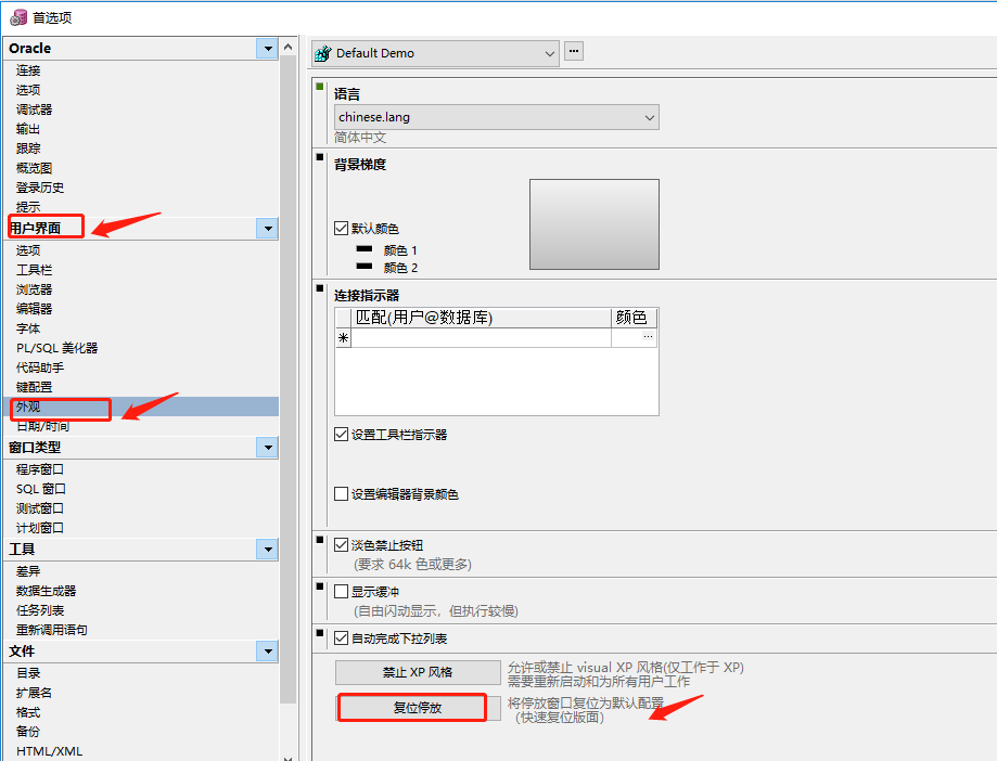 2)中文:工具->首选项->用户界面->外观->复位停放