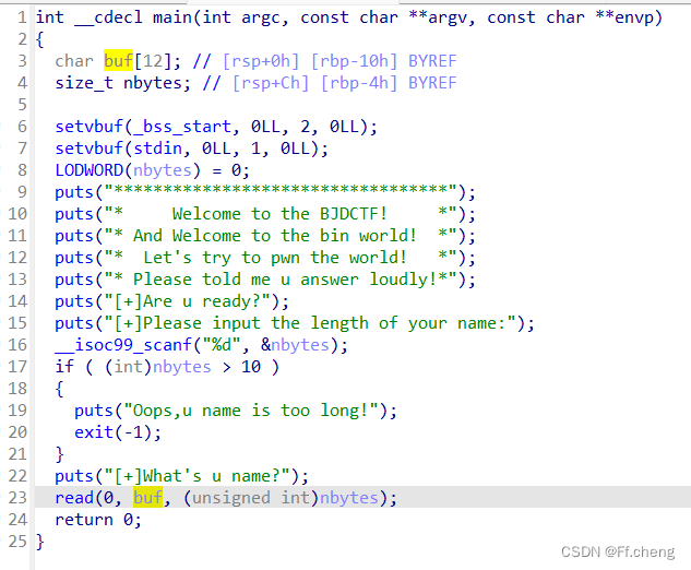 64位,有后门函数,这题考察一个有/无符号数,当输入0xffff,无符号型整数会认为是一个很大的数,但是对于有符号数就是 -1